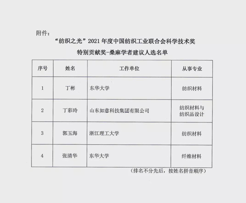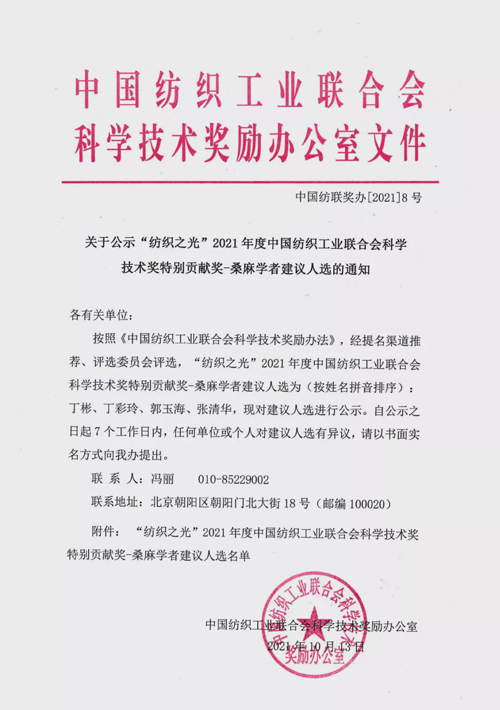 | “紡織之光”2021年度中國紡聯(lián)科技獎特別貢獻(xiàn)獎-桑麻學(xué)者建議授獎人選評出 |