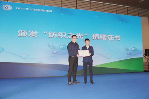 隨后,紡織之光科技教育基金會(huì)副秘書長陳思奇向江蘇富之島美安紡織品科技有限公司董事長張沖頒發(fā)“紡織之光”捐贈(zèng)證書。