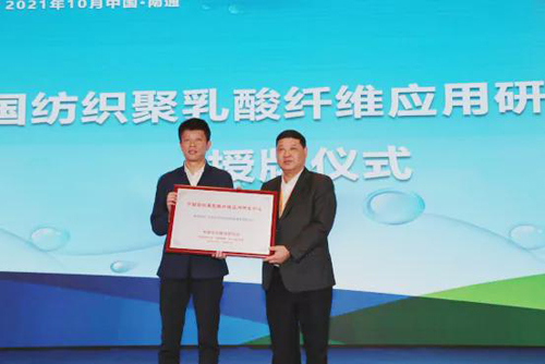 郭宏鈞宣讀了《關(guān)于成立中國紡織聚乳酸纖維應(yīng)用研發(fā)中心的函》,決定在江蘇富之島美安紡織品科技有限公司設(shè)立“中國紡織聚乳酸纖維應(yīng)用研發(fā)中心”,致力于綠色環(huán)保聚乳酸纖維材料在紡織品的應(yīng)用開發(fā),在家紡、服裝類市場形成較強(qiáng)的產(chǎn)品設(shè)計(jì)開發(fā)和技術(shù)創(chuàng)新能力。馮德虎向江蘇富之島美安紡織品科技有限公司董事長張沖授牌。