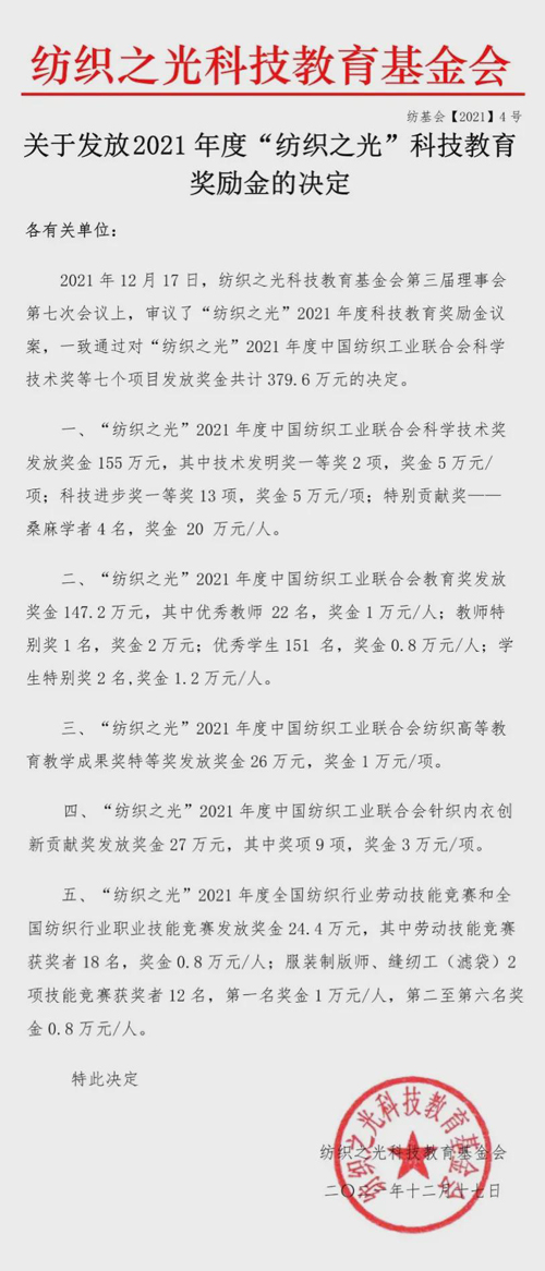 2021年12月17日,紡織之光科技教育基金會第三屆理事會第七次會議在北京舉行。會議審議了“紡織之光”2021 年度科技教育獎勵金議案,一致通過對“紡織之光”2021 年度中國紡織工業聯合會科學技術獎、“紡織之光”2021 年度中國紡織工業聯合會教育獎、“紡織之光”2021 年度中國紡織工業聯合會紡織高等教育教學成果獎、“紡織之光”2021 年度中國紡織工業聯合會針織內衣創新貢獻獎、“紡織之光”2021年度全國紡織行業勞動技能競賽和全國紡織行業職業技能競賽等項目發放獎金共計379.6萬元的決定。現將決定公布如下: