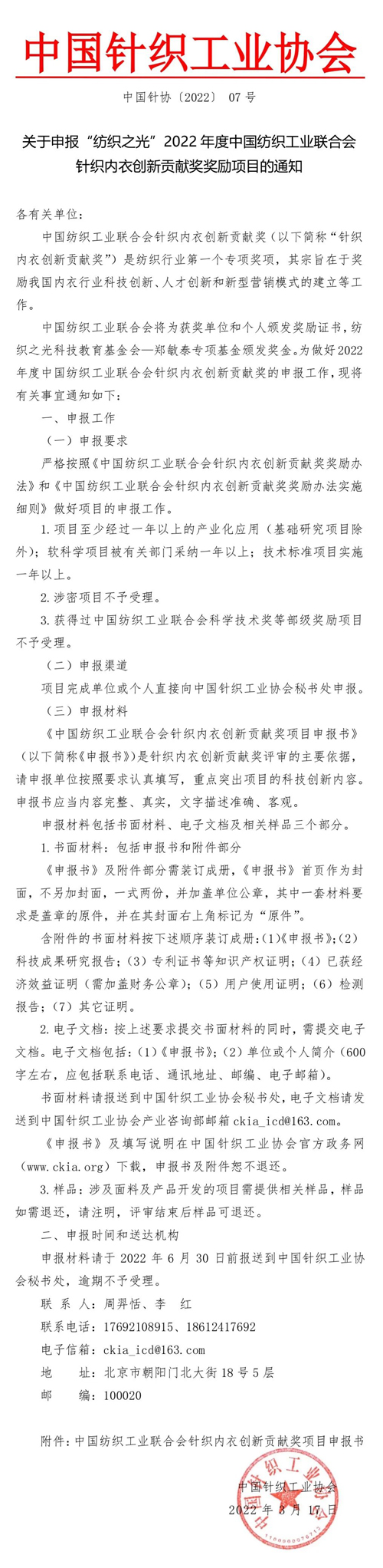 中國紡織工業聯合會將為獲獎單位和個人頒發獎勵證書,紡織之光科技教育基金會—鄭敏泰專項基金頒發獎金。為做好2022年度中國紡織工業聯合會針織內衣創新貢獻獎的申報工作,現將有關事宜通知如下: