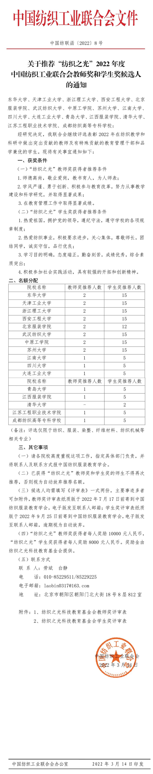 “紡織之光”2022年度中國紡織工業(yè)聯(lián)合會教師獎和學生獎候選人開始推薦