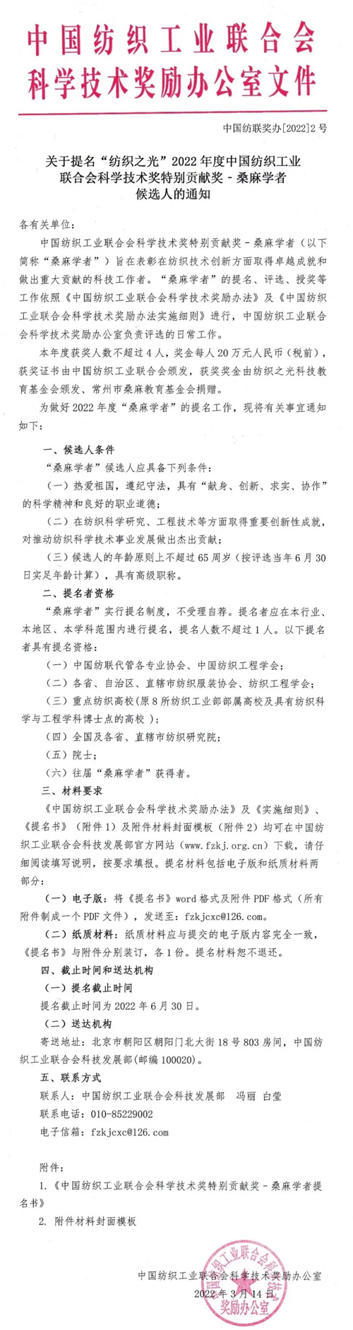 | “紡織之光”2022年度中國紡聯科技獎特別貢獻獎‐桑麻學者候選人提名啟動 |