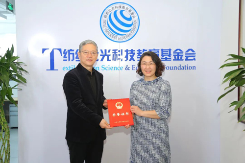 ![]() 中國紡聯(lián)副會長夏令敏向基金會頒發(fā)“全國先進社會組織”證書,紡織之光科技教育基金會副理事長兼秘書長張翠竹接受證書。