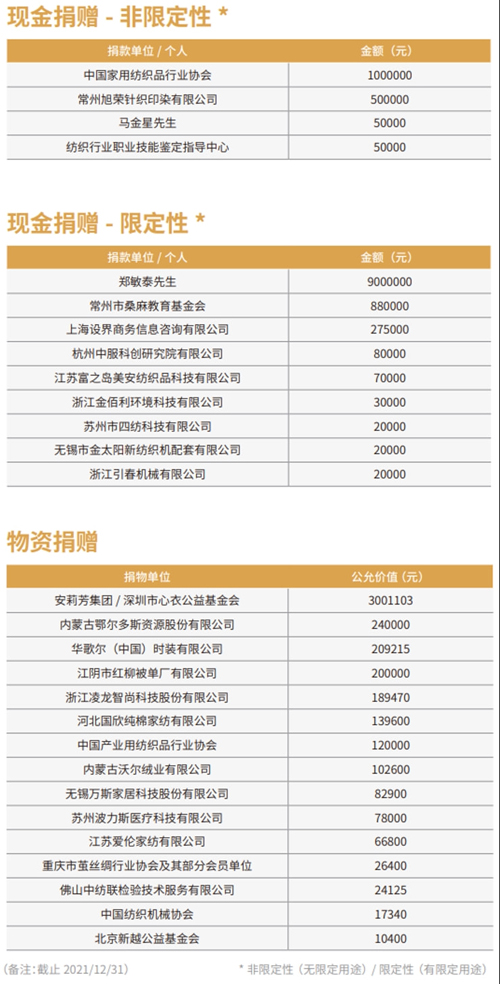 為做好2022年紡織之光基金會全年工作安排,基金會秘書處充分征求相關項目承擔單位意見,全面分析基金會發展面臨的形勢,堅持穩中求進,確定2022年基金會預算計劃,本年度預算總收入1641萬元,比上年有所減少,本年度預算總支出1632.2萬元,比上年實際支出增加79.4萬元。支出增加主要原因是上年疫情影響,部分公益項目計劃沒有開展,在本年度繼續列支。在確保公益活動支出占上年凈資產比例超過8%,確保管理費用占全年總支出比例不高于12%前提下,以收支基本平衡、略有盈余為基準,繼續支持“紡織之光”科技教育獎勵項目、應用基礎研究、成果推廣、“紡織之光·愛益行”、“紡織之光論壇”等行業公益慈善項目的立項實施。 2022年是紡織之光基金會開展紡織行業科技教育獎勵公益活動25周年,基金會提出以紡織行業科技教育公益事業發展為中心,匯聚更多的行業慈善資源,建立行業慈善公益平臺,完善《基金會五年發展規劃》,規范管理,提升服務能力,有效發揮行業慈善公益組織作用,重點做好以下工作:一是依據紡織行業“十四五”規劃和慈善事業發展規劃,結合基金會行業發展,完善中期發展規劃;二是提高服務理事治理能力;三是研究探索擴大籌款新途徑,推動設立有特色、有吸引力的專項基金;四是以提升項目績效為目標,支持開展行業科教公益項目;五是圍繞“紡織之光科技教育基金會支持行業科技教育獎勵25周年”,開展系列宣傳活動;六是不斷加強秘書處團隊科學化、專業化能力建設。 紡織之光基金會理事長葉志民表示:2022年,基金會將繼續支持行業科教公益事業,同時,要優化各個公益項目運行模式,把每一分錢用好。此外,要利用各種機會,讓行業了解、認識并支持基金會。基金會將繼續堅持初心和使命,與各方攜手合作,重點加強專項基金的設立。努力將“紡織之光”打造成為愛心企業家的交流平臺、紡織行業慈善平臺。 附:2021年度紡織之光科技教育基金會捐贈人名單