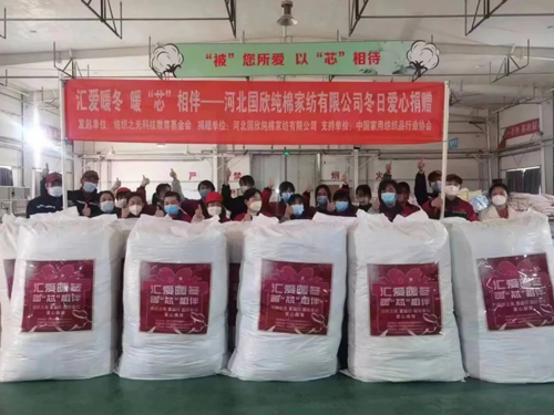 ![]() 此次捐贈(zèng)是國(guó)欣家紡第二次參加“紡織之光?愛(ài)益行”活動(dòng),公司相關(guān)負(fù)責(zé)人表示,扶弱濟(jì)困是中華民族的傳統(tǒng)美德,作為社會(huì)群體中的一份子,國(guó)欣家紡一直把“感恩、責(zé)任、奉獻(xiàn)”作為履行社會(huì)責(zé)任和義務(wù)的標(biāo)準(zhǔn),國(guó)欣人一直踐行的“如果愛(ài),請(qǐng)全愛(ài)”,以感恩之心樹(shù)立責(zé)任意識(shí),以責(zé)任意識(shí)展現(xiàn)奉獻(xiàn)精神。此次響應(yīng)中國(guó)家用紡織品協(xié)會(huì)的號(hào)召,參與紡織之光?愛(ài)益行的公益活動(dòng),本著讓貧困地區(qū)的同胞感受到冬季溫暖,國(guó)欣人以自己的方式匯愛(ài)暖冬、暖“芯”相伴,奉獻(xiàn)于社會(huì)。公司此次為貧困地區(qū)的同胞們送去成人、兒童以及嬰幼兒的一千多套棉衣被物資,就是為了讓社會(huì)多一份關(guān)愛(ài),人間多一份真情,國(guó)欣人衷心祝愿每一位同胞的生活都能無(wú)病無(wú)災(zāi)溫馨順?biāo)臁?guó)欣家紡將會(huì)繼續(xù)傳遞愛(ài)心接力棒,用國(guó)欣人的暖“芯”溫暖到每一位需要的人。