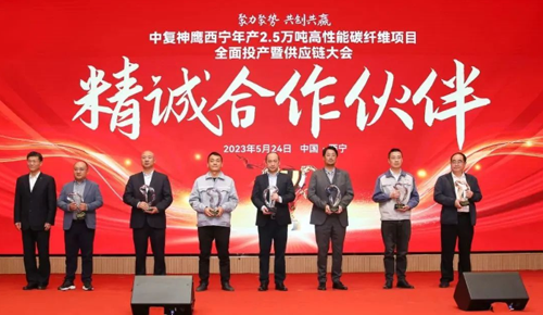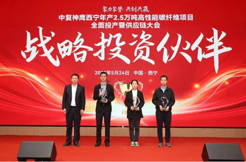 ![]() 成立至今,在合作伙伴的鼎力支持和配合下,中復(fù)神鷹實(shí)現(xiàn)了高質(zhì)快速發(fā)展。此次大會(huì),中復(fù)神鷹誠(chéng)摯邀請(qǐng)了供應(yīng)鏈上下游的合作伙伴齊聚西寧,共同慶祝項(xiàng)目投產(chǎn)并共議未來(lái)發(fā)展。會(huì)上,中復(fù)神鷹分別與能源保障、原材料供應(yīng)以及市場(chǎng)應(yīng)用領(lǐng)域代表簽署合作協(xié)議,并為重要合作伙伴頒發(fā)榮譽(yù)紀(jì)念獎(jiǎng)牌,江蘇鷹游紡機(jī)公司獲精誠(chéng)合作伙伴榮譽(yù)。在以后的合作中,中復(fù)神鷹與各位合作伙伴將充分發(fā)揮自身優(yōu)勢(shì),積極拓展合作空間,實(shí)現(xiàn)共贏發(fā)展。