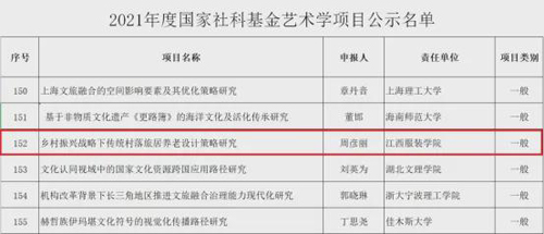 近日,全國哲學社會科學工作辦公室公示了2021年度國家社科基金藝術學項目立項名單,江西服裝學院藝術設計學院副教授周彥麗申報的國家社科基金藝術學項目《鄉村振興戰略下傳統村落旅居養老設計策略研究》獲立項公示。據介紹,這是江西服裝學院首次獲批國家社科基金藝術學項目,標志著江西服裝學院在國家社科基金藝術學項目立項方面取得了重大突破。 ![]() 2021年度國家社科基金藝術學擬立項項目共221個,其中重點項目17個,一般項目151個,青年項目29個,西部項目24個。