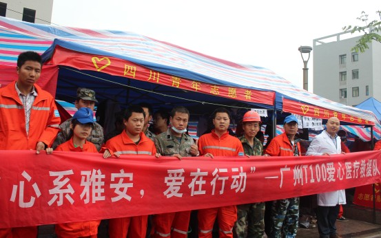 時間就是生命。廣州T100醫療救援隊,從廣州輾轉成都,與兩支曾經在汶川地震和玉樹地震中屢屢立功的民間專業救援團隊——廣東“陽光公益聯盟”和浙江海鷹救援大隊會合后,第一時間趕赴救援第一線,一路顛簸趕到蘆山縣,當得知太平鎮災情較為嚴重的消息時,連夜克服余震頻發、下雨路滑、山路塌方等重重障礙,成功抵達太平鎮,積極參與救治工作。