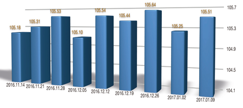 “中國·柯橋紡織指數(shù)” 20170109期紡織品價格指數(shù)收報于105.51點,環(huán)比上漲0.25%,較年初上漲0.25%,同比上漲1.30%。 總價格指數(shù)