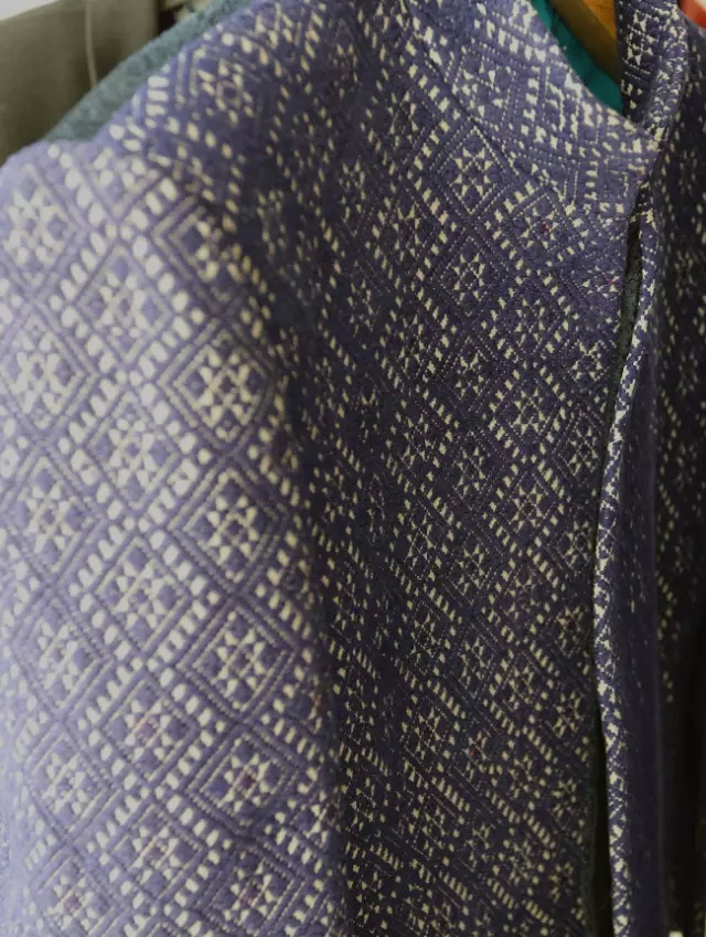 苗凈系列將苗族服飾中最典型的紫色、玫紅配以黛綠、群青及墨黑,呈現出神秘而優雅的色調;而苗族精美生動的織、繡圖案記載了苗族從黃河流域過長江、越洞庭、翻武陵的遷徙過程,用熱愛生活和無與倫比的創造美的能力,造就苗族服飾色彩搭配、工藝手法還是故事題材都最為絢麗和豐富的部分。