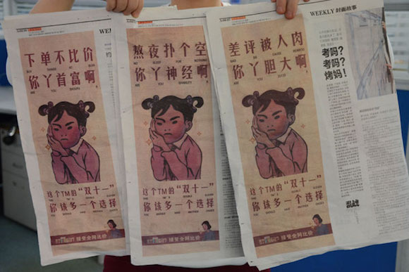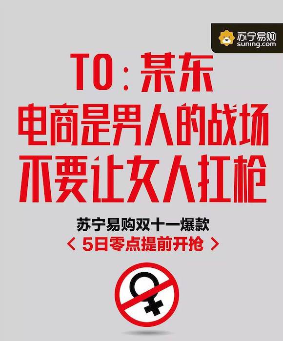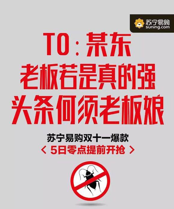 不過,在由“互黑”走向“結盟”之后,今年與阿里聯合的蘇寧易購則將炮火對準了京東?!斑^去我們不針對京東,因為怕別人說我們欺負小孩子,現在它企業也上市了,他們決定和京東實打實的干一場”,半月前,蘇寧云商集團副董事長孫為民在“雙十一”天貓北京發布會上曾這樣表示。 蘇寧的“約戰”很快變成了現實,11月4日,一組由蘇寧官方微信平臺推送的海報開始在社交網絡與平面媒體中瘋傳,其中“老板若是真的強 頭條何須老板娘”等文案,與海報中明顯的“蟑螂小強”符號直指京東商城CEO劉強東及其夫人章澤天。 這種針鋒相對的推廣方式自然容易成為人們津津樂道的話題,發布不過幾小時,這則推文已經超過了十萬閱讀數。
