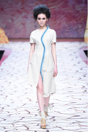 隨著新疆紡織服裝產(chǎn)業(yè)熱度的飆升,這場秀被賦予了更多的代表性意義。新疆本土設(shè)計(jì)師陶陶的設(shè)計(jì)靈感來源于新疆獨(dú)有的雅丹地貌,延續(xù)使用了亞麻面料的樸實(shí)質(zhì)感,運(yùn)用抽紗、褶皺表達(dá)雅丹柔美與雄渾。
