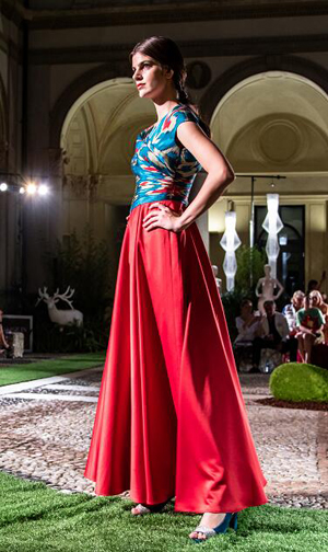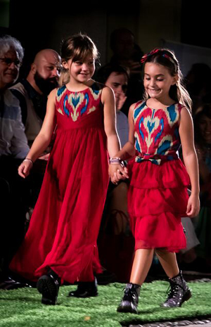 新疆國之樺服裝設計研發有限公司總經理、設計師王一樺表示,這個系列服裝的主色調以中國紅為主色,配上紅綠色相間的艾德萊斯布料,通過西方立體裁剪、立體皺褶設計手法和工藝,把東西方文化和民族文化完美融合,將民族服飾特色文化內涵再次升華,整組服裝簡潔、大氣、時尚、高雅。
