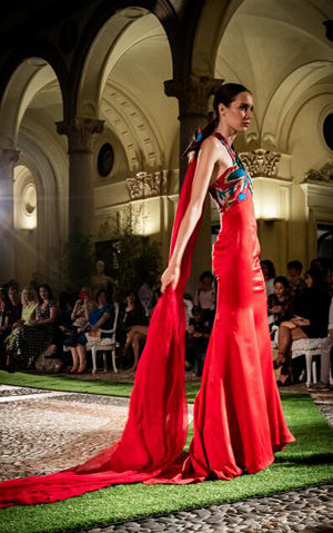 “此次系列的設計靈感來源于蝴蝶破蛹成蝶后的美麗。各種色彩斑斕的蝴蝶在綠色的山谷中、花叢中翩翩起舞,美不勝收。整個系列以中國紅為主色調,把中國元素、民族元素和西方立體設計概念融合到所有的服裝中。”