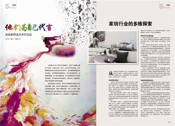 從觀望到成為電商發(fā)展的主力軍,從家紡拓展到大家居,家紡行業(yè)不單單是一個傳統意義上的紡織產業(yè),它始終以市場需求為導向,加快結構調整,在各個領域探索合作機會,成為紡織行業(yè)的一個閃光領域。家紡集群還提出了“大家居”的概念,尋求與家具企業(yè)、設計師的跨界合作,在智能制造方面也頗有亮點。