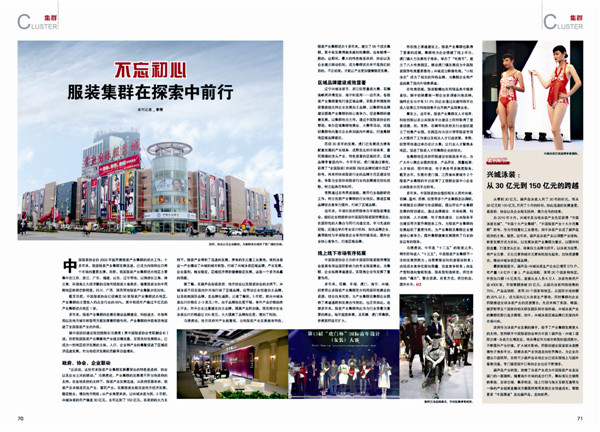 服裝產業(yè)集群最大的特色就是政府、協會以及企業(yè)建立聯動機制。各服裝產業(yè)集群重視打造區(qū)域品牌,采取多種措施和政策鼓勵支持企業(yè)發(fā)展自主品牌。在線上渠道建設上,服裝產業(yè)集群也取得了顯著的成績,集群地為企業(yè)搭建了線上平臺。服裝產業(yè)集群在人才培養(yǎng)、科技創(chuàng)新以及公共服務平臺建設上同樣取得了顯著成績。中國服裝產業(yè)集群下一步的發(fā)展思路為:由要素驅動向創(chuàng)造驅動轉變;由低成本競爭優(yōu)勢向質量、效益競爭轉變;由生產型制造向智能制造、服務型制造轉變,抓住市場的“痛點”,整合資源,改變方式,抓住機會,提升水平。
